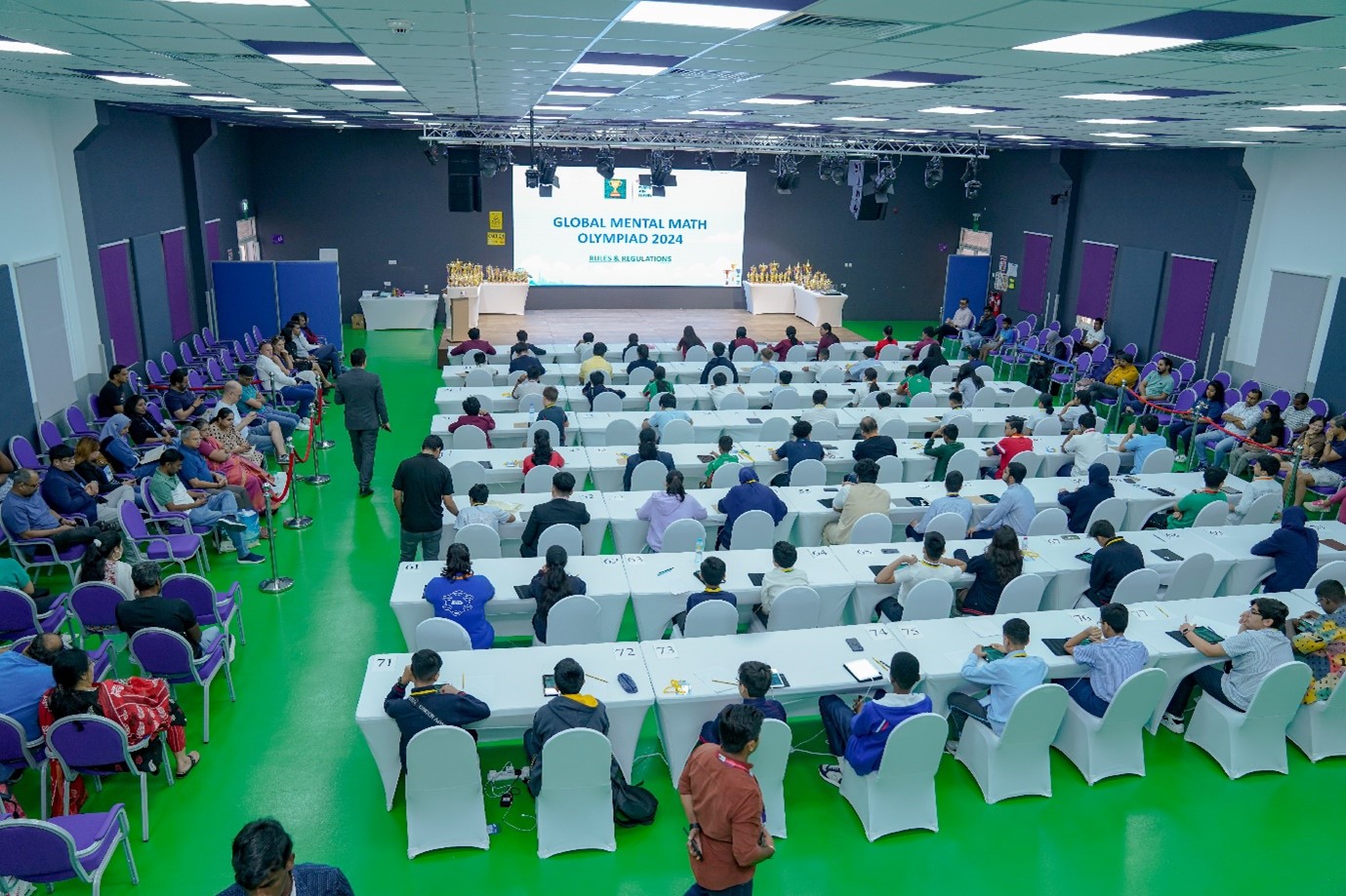 The Global Mental Math Olympiad (GMMO) is far from a typical competition—it’s a true arena-style mental sporting event! Imagine stepping into an environment buzzing with live energy, where contestants are surrounded by a live audience, an interactive leaderboard, instant results, and the sounds of real-time cheering. This setup is designed to simulate real-world challenges, pushing participants to stay focused amid the dynamic atmosphere. Just as in any major sporting event, participants feel the thrill and intensity of competing in front of others, making each calculation under the gaze of an enthusiastic crowd. GMMO’s format transforms mental math into a full-scale, adrenaline-fueled experience where every answer counts.
