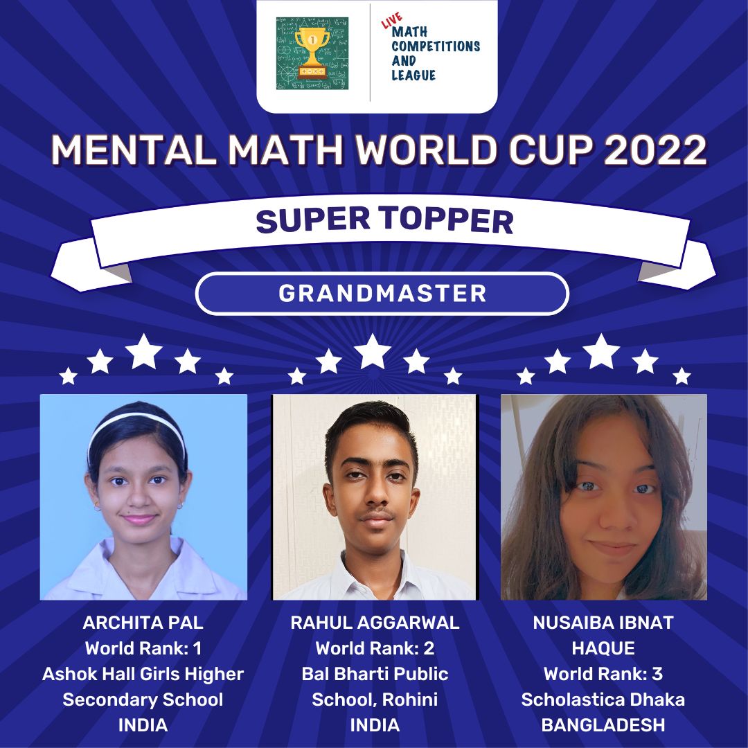 The following Participants from Bangladesh and India have won the top ranks in the GRANDMASTER category and the Title of Mental Math World Cup Super Topper in the GRANDMASTER Category: