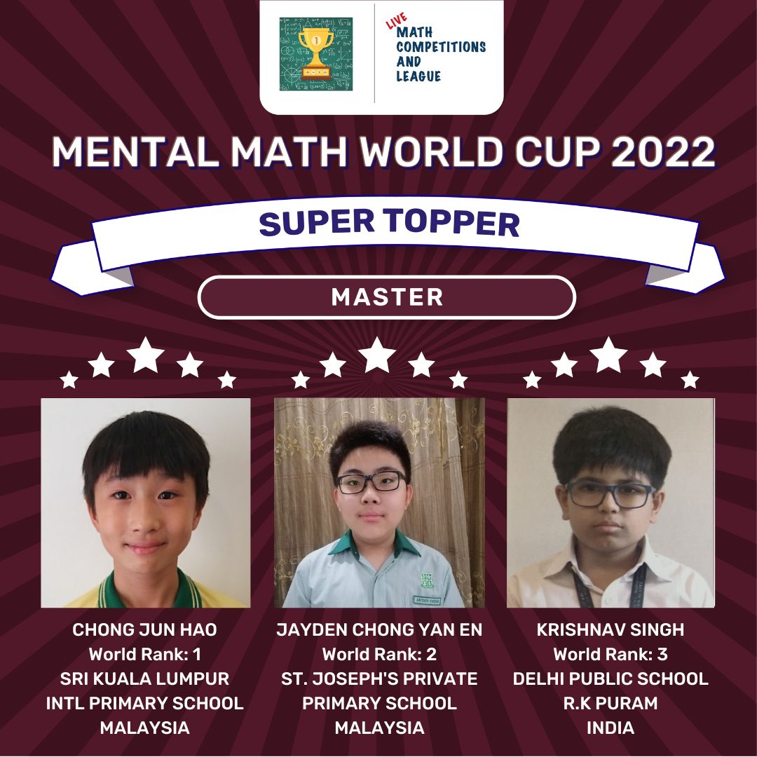 The following Participants from Malaysia and India have won the top ranks in the Master category and the Title of Mental Math World Cup Super Topper in the Master Category: